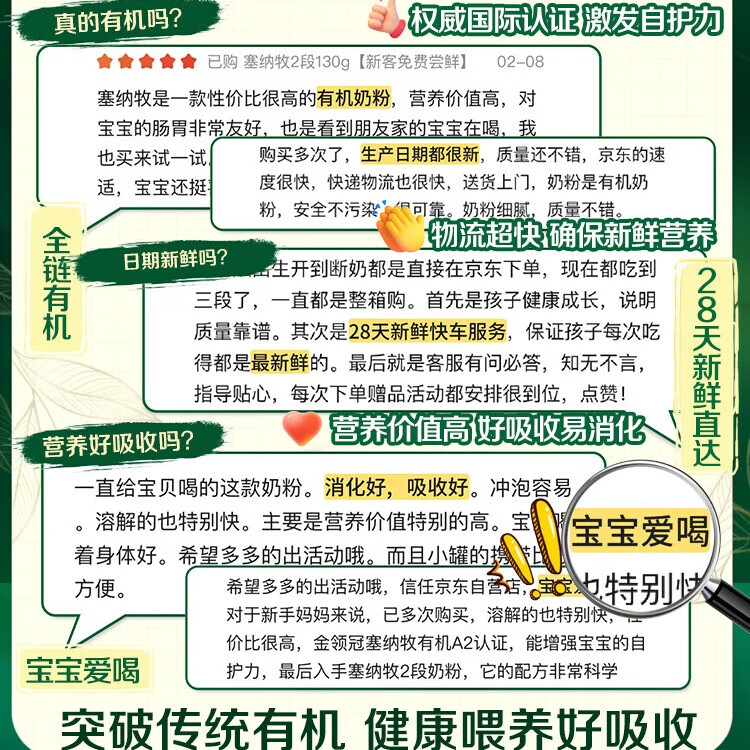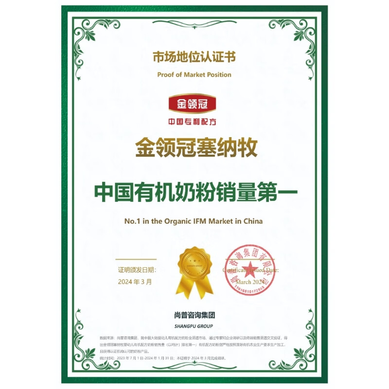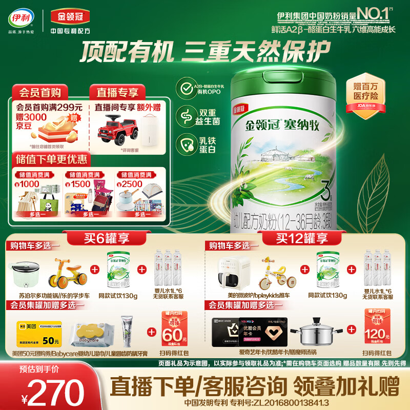 伊利金领冠塞纳牧有机A2β-酪蛋白奶粉3段(1-3岁)800g