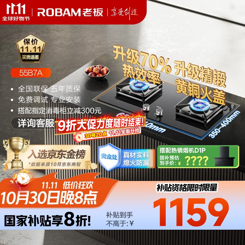 老板(Robam)【搭配老板小黑翼系列】【70%热效率】JZT-55B7A天然气燃气灶煤气灶灶具国家补贴5.2kW火力猛火灶
