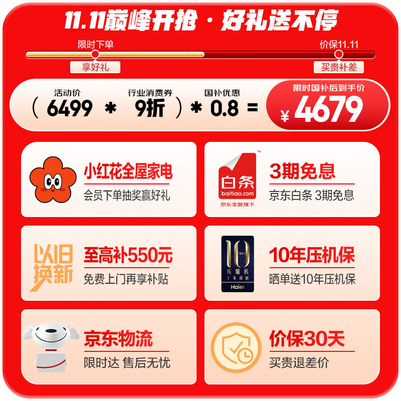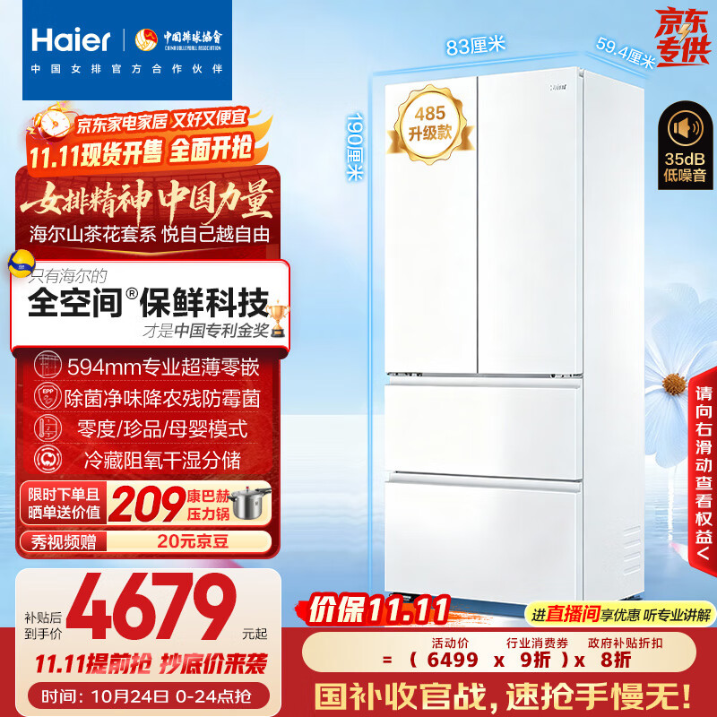 海尔(Haier)「山茶花485升级」510升全空间保鲜594mm超薄零嵌法式多门电冰箱一级能效BCD-510WGHFD1BWFU1