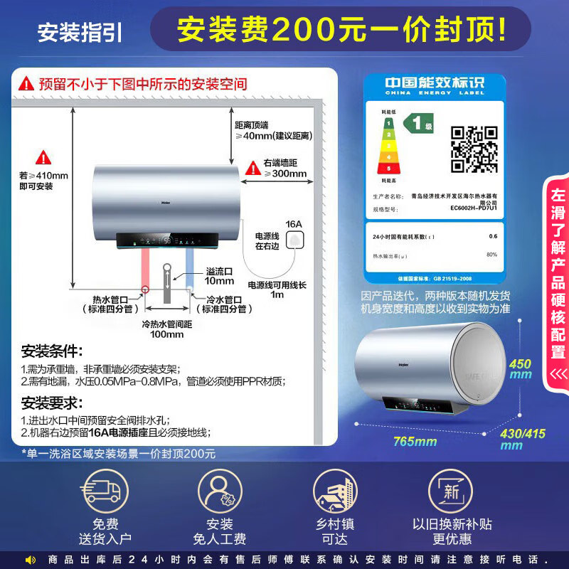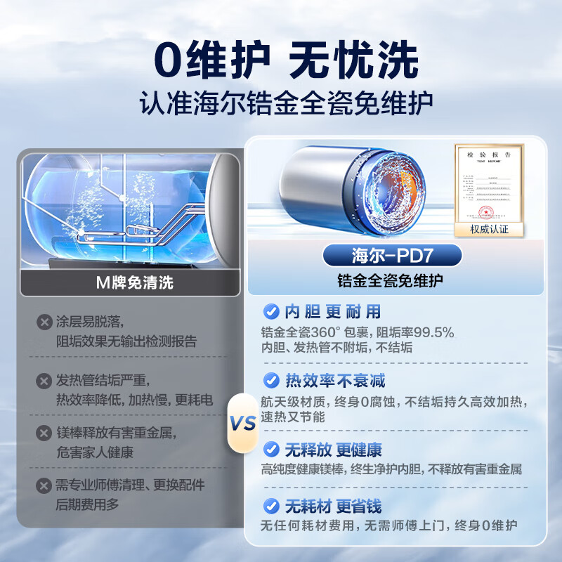 海尔(Haier)国家补贴20%电热水器60升 PD7 金刚无缝胆 水电分离3300W变频速热一级能效终身免换镁棒家用储水式