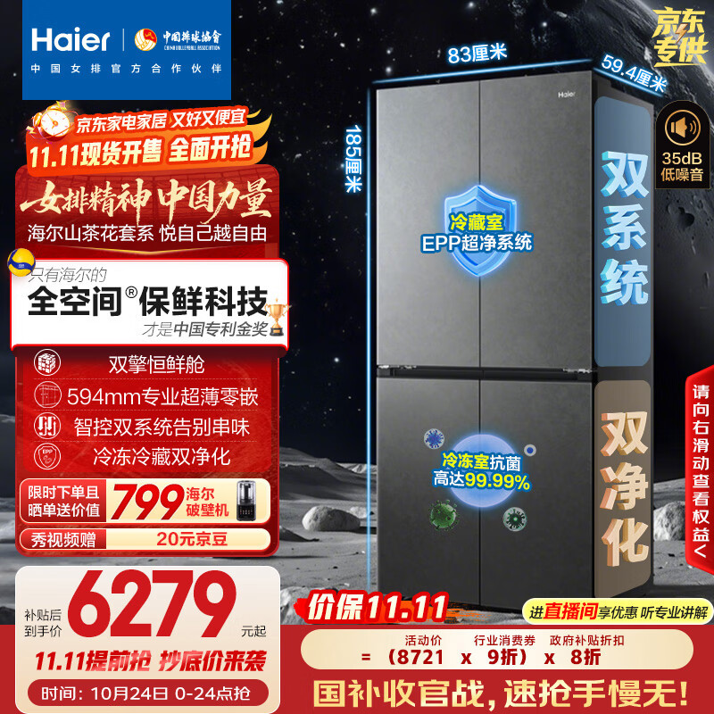 海尔(Haier)「山茶花-曜夜」502升双擎恒鲜舱双系统全空间保鲜594mm超薄零嵌十字冰箱BCD-502WGHTD1CYXU1