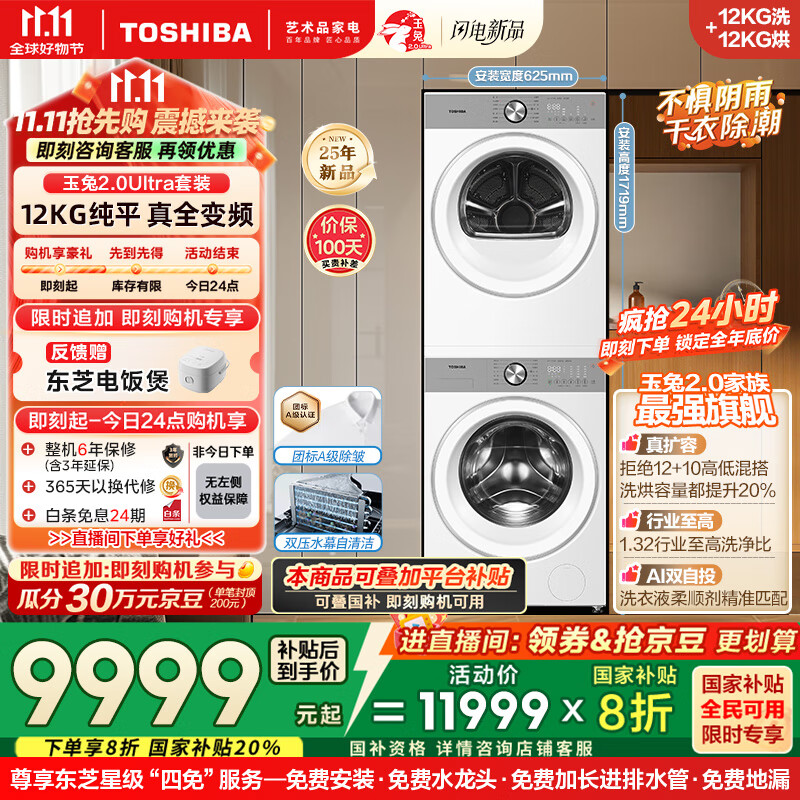 东芝(TOSHIBA)玉兔2.0Ultra洗烘套装 DG-12T18BW+T18BW 12KG大容量滚筒全自动洗衣机+变频热泵烘干机 洗净比1.32