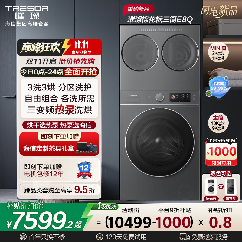 海信(Hisense)璀璨棉花糖三筒E8Q 全家筒洗衣机 4合1热泵洗烘活水健康自由组合 懒人0手洗WH130E8Q+WV20G-H