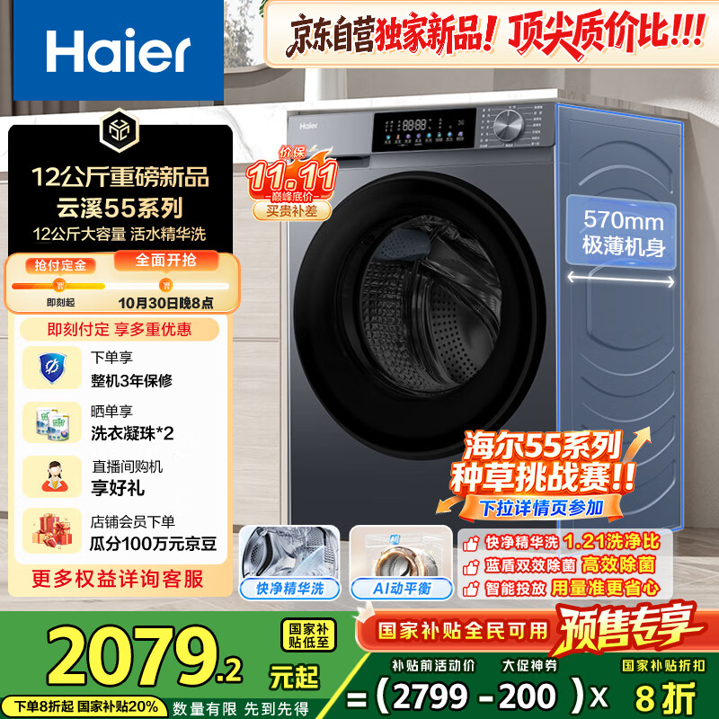 海尔(Haier)滚筒洗衣机全自动12公斤 超薄家用家电国家补贴 京东自营云溪55J7 一级能效以旧换新 内衣洗出租房