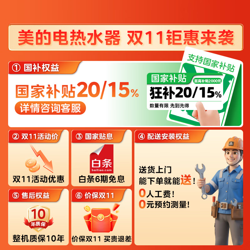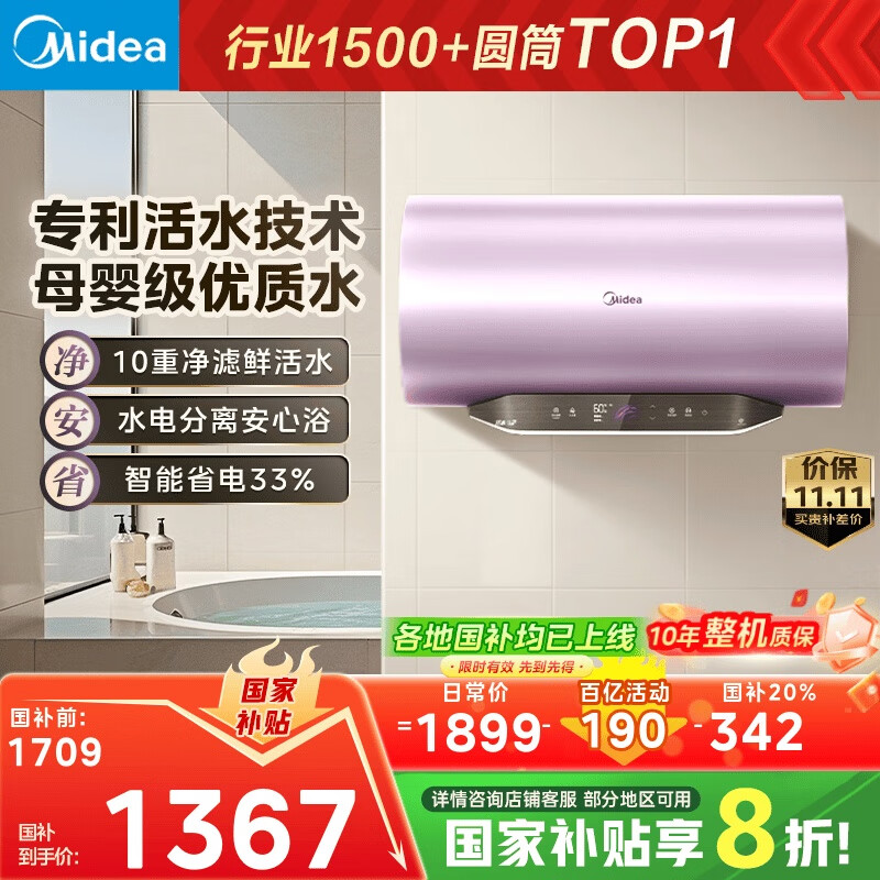 美的(Midea)TECH活水电热水器60升3200W变频速热 10重过滤终身镁棒免更换以旧换新 国家补贴20% F6032-RW7(HE)