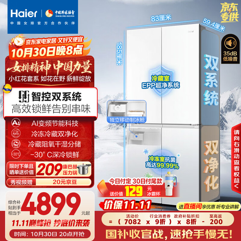 海尔(Haier)「小红花2.0」501升双系统594超薄零嵌十字门双循环家用电冰箱BCD-501WGHTDC4FBU1国家补贴20%