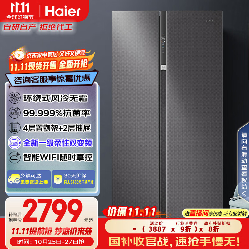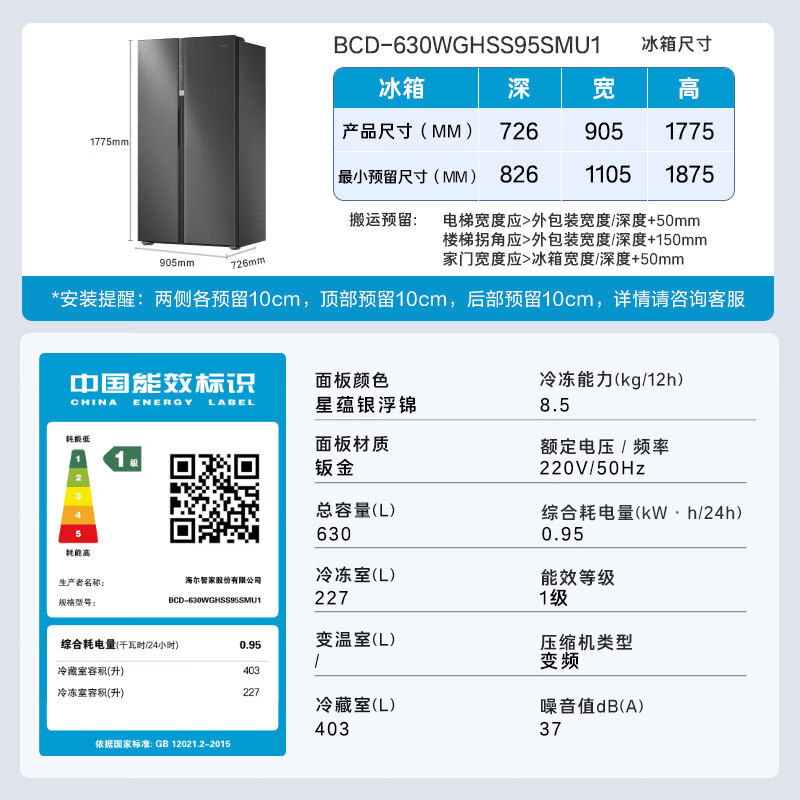 海尔(Haier)盛宴630升风冷无霜对开门电冰箱双开门家用一级能效变频节能大容量国家补贴20%BCD-630WGHSS95SMU1