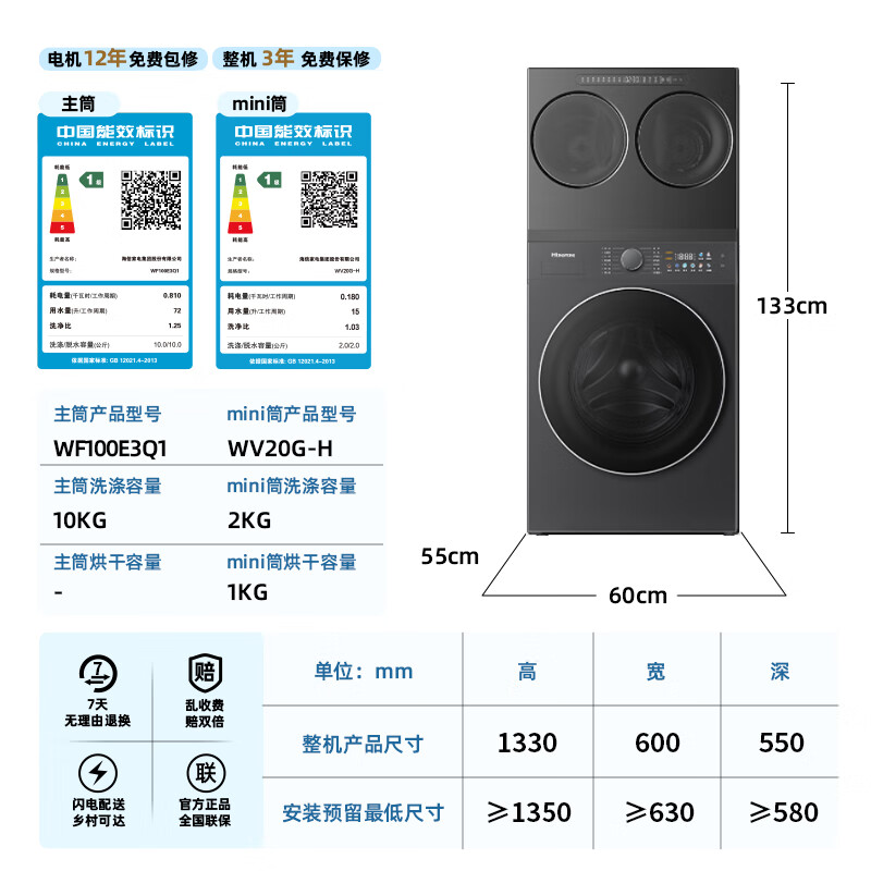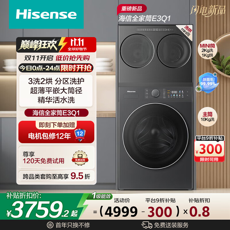 海信(Hisense)全家筒三筒洗衣机 3洗2烘 活水健康 三桶自由组合 懒人0手洗 WF100E3Q1+WV20G-H 以旧换新补贴