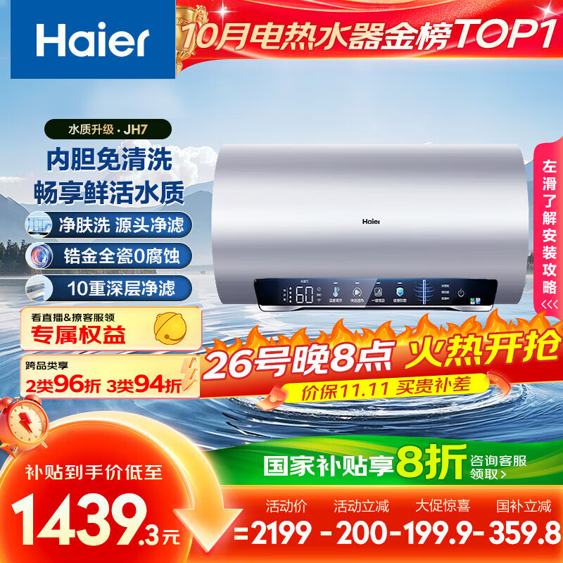 海尔(Haier)国家补贴20%电热水器80升 JH7 无垢鲜活水净肤洗 免清洗 3300W变频速热 一级能效节能 家用储水式