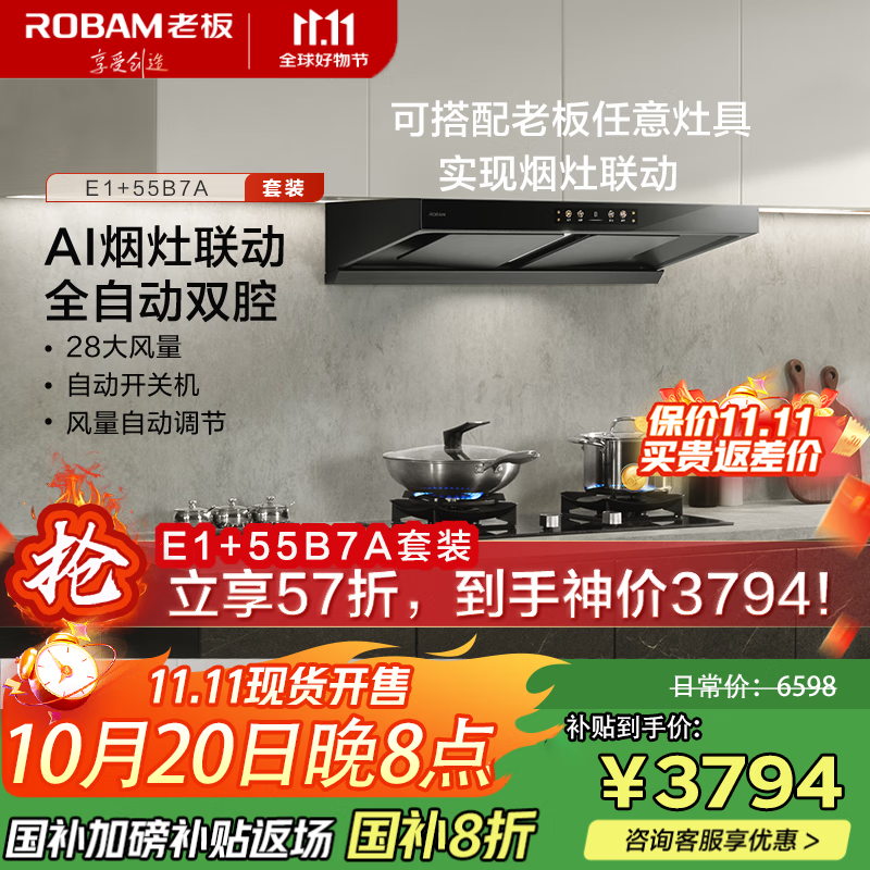 老板(Robam)【李佳琦同款】抽吸排家用烟灶联动双腔28大吸力以旧换新家电智能双子星E1+55B7A【套装商品】