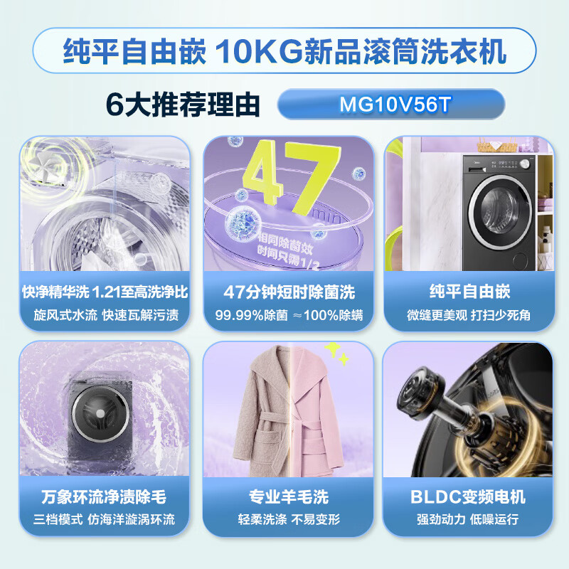 美的(Midea)滚筒洗衣机全自动家用 MG10V56T 10公斤变频 纯平自由嵌 1.21高洗净比 除菌除螨 快净2.0 国家补贴