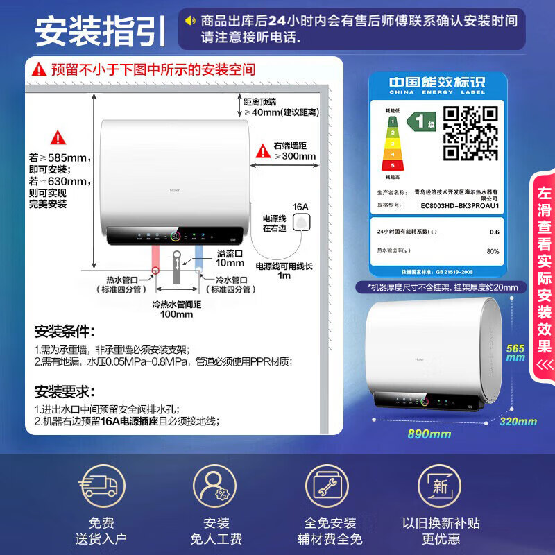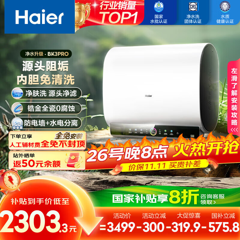 海尔(Haier)国家补贴20%双胆扁桶电热水器80升 BK3PRO 小魔盒鲜活水 净肤洗AI智慧 3300W速热免清洗镁棒免更换
