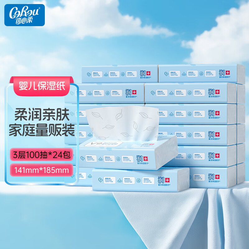 可心柔(COROU)抽纸 婴儿柔纸巾搜索词 3层M码100抽*24包保湿纸巾 云柔巾 乳霜纸