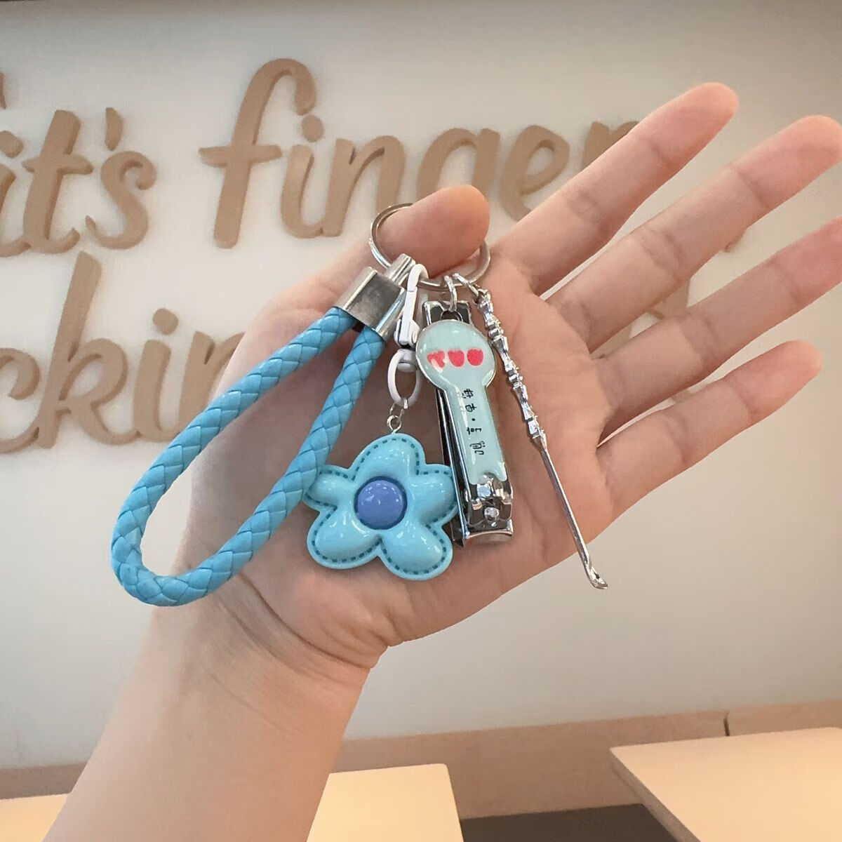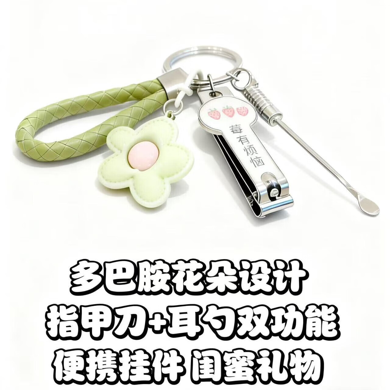 多巴胺彩色花朵钥匙扣少女宝宝挂饰指甲刀耳勺钥匙挂件套装 粉编织绳粉色草莓指甲剪+粉耳勺