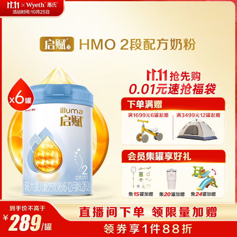 惠氏(Wyeth)启赋蓝钻HMO较大婴儿配方奶粉2段(6-12月)810g*6罐