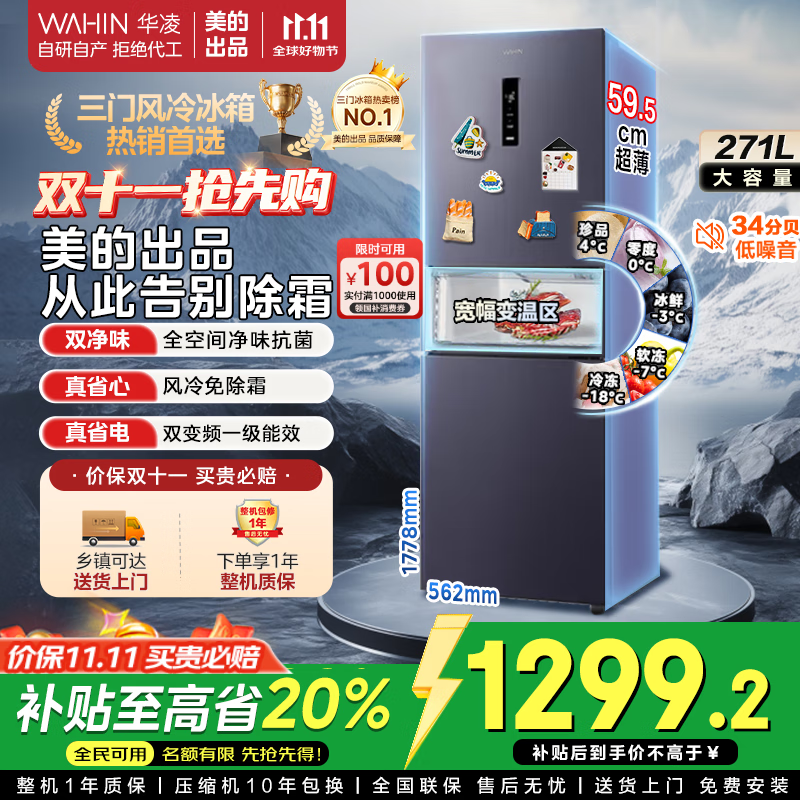 美的出品华凌282三门薄一级能效风冷无霜双变频变温冷藏冷冻净味冰箱家电HR-282WTPZ