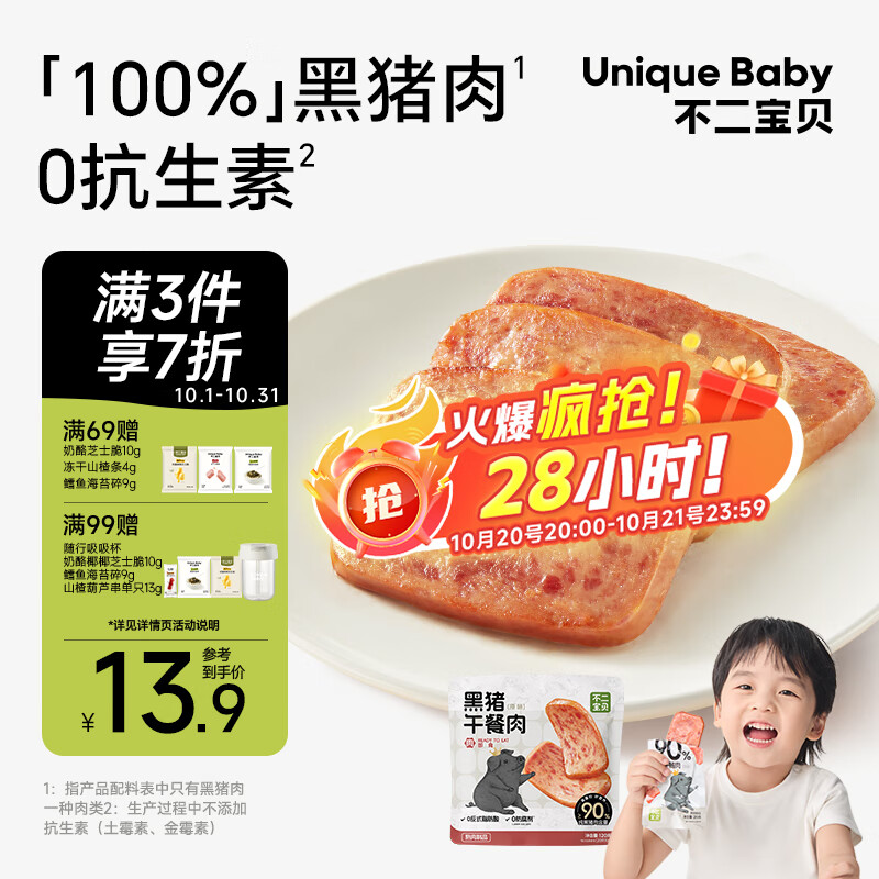 不二宝贝 儿童黑猪午餐肉无蔗糖 儿童宝宝零食搭配宝宝罐头120g单独6片