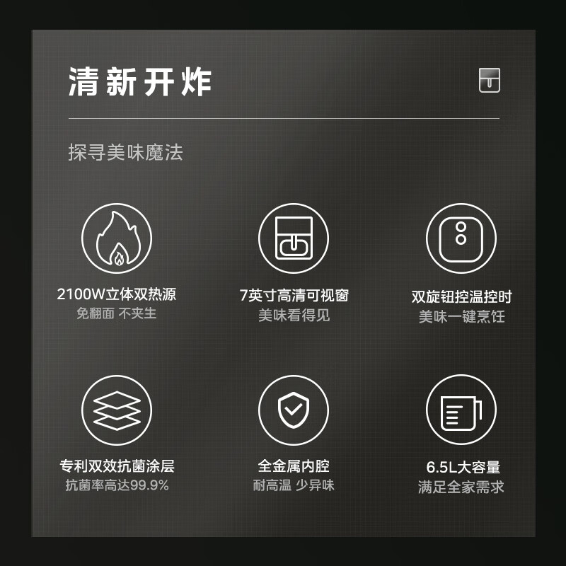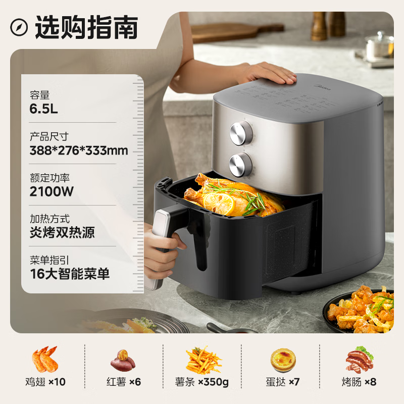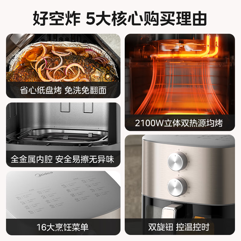 美的(Midea)免翻面空气炸锅炎烤双热源 可视大视窗 实用大容量6.5L 旋钮家用小家电 蒸烤一体金属内腔 KZE6559