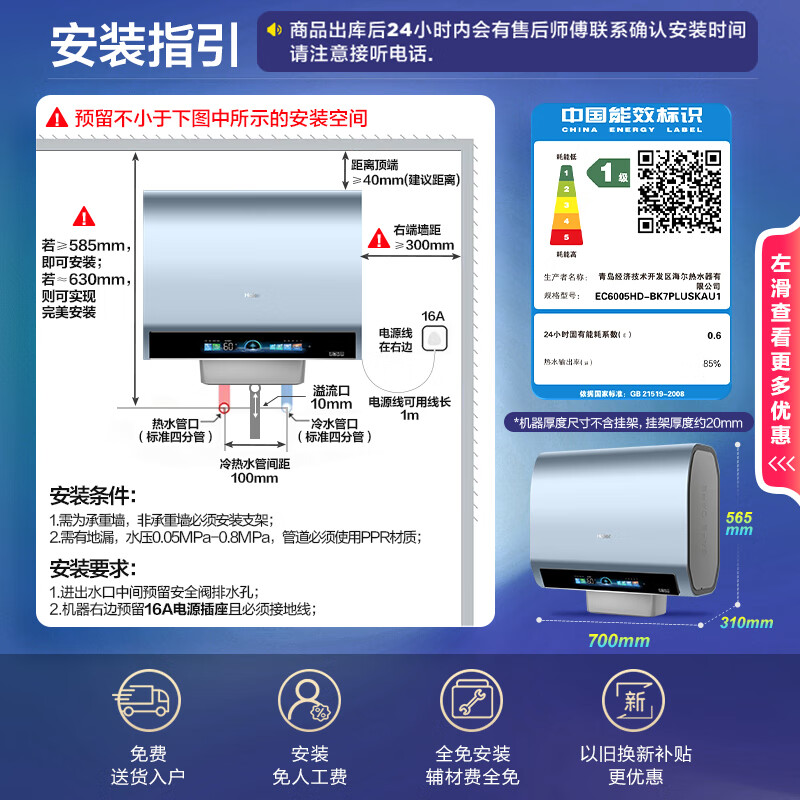 海尔(Haier)麦浪套系电热水器 国家补贴20%双胆扁桶60升BK7PLUS BK7升级小蓝瓶无镁棒净肤洗3D巨能洗速热家用