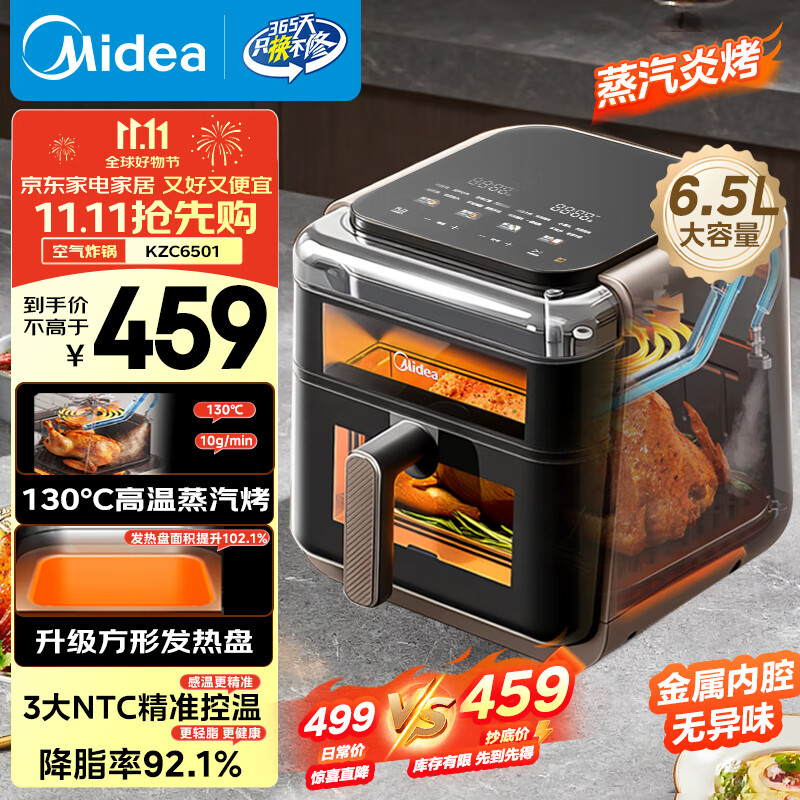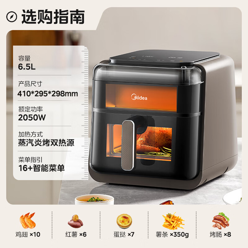 美的(Midea)蒸汽炎烤空气炸锅上下双热源 家用大容量6.5L 上下双可视大视窗 烤箱一体机三合一金属内腔KZC6501