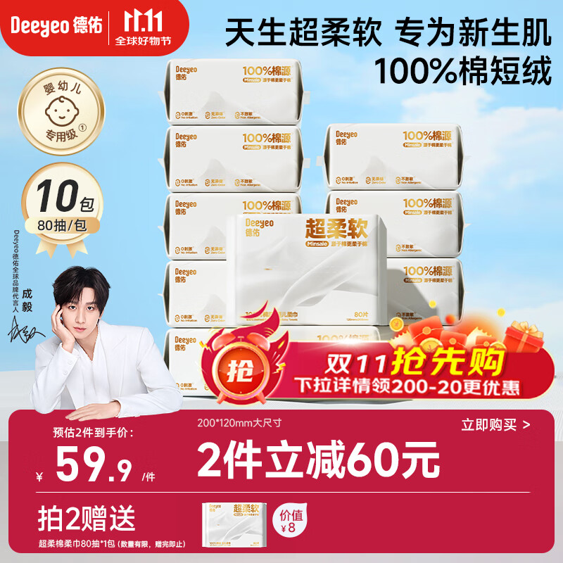 德佑超柔棉柔巾100%棉源婴儿洗脸巾干湿两用新生儿专用洁面巾80抽10包