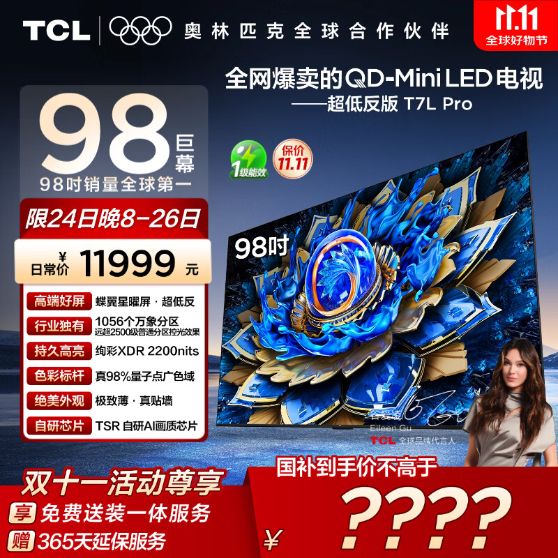 TCL电视 98T7L Pro 98英寸 QD-Mini LED 蝶翼星曜屏 万象分区 绚彩XDR 超薄 98/100英寸电视 国家补贴