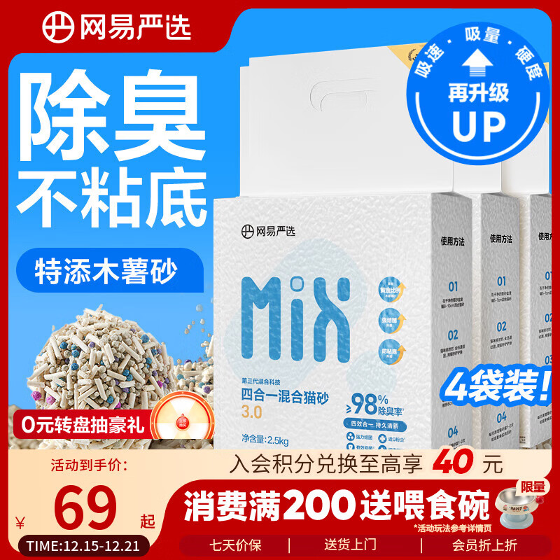 网易严选四合一豆腐膨润土植物混合猫砂结团不沾底除臭木薯猫砂 2.5kg*4包