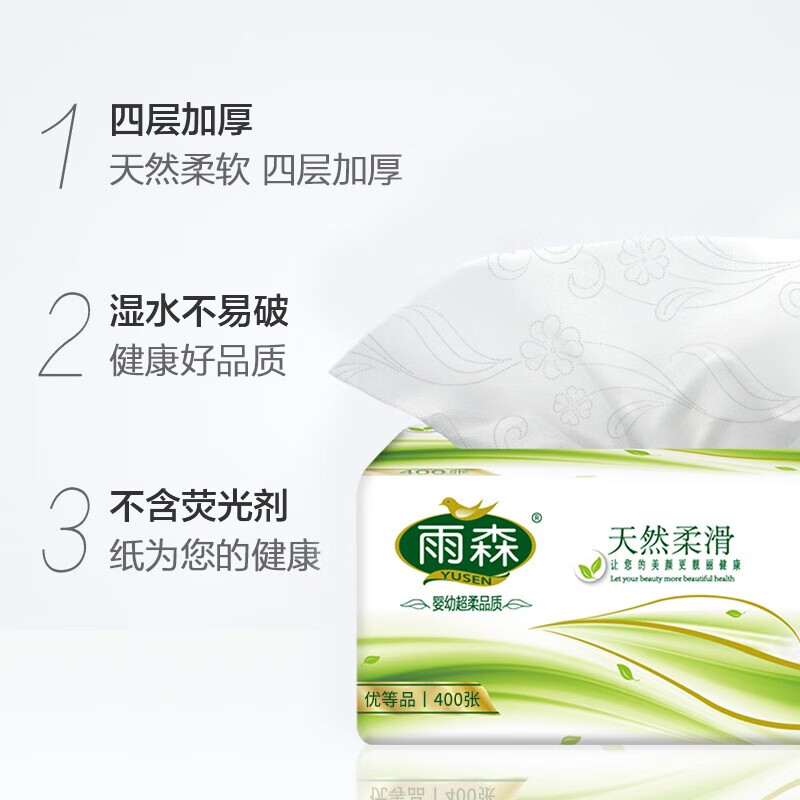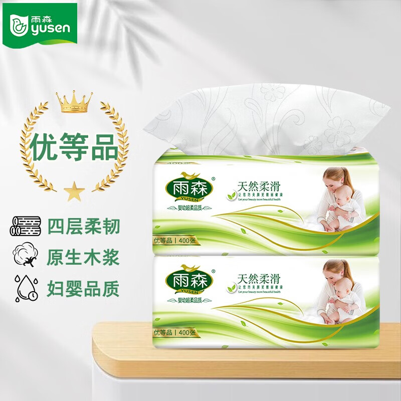 雨森(YUSEN)妇婴抽纸400张宝宝可用100抽大包福利装生活用纸厕纸卫生纸 4层 400张*2包