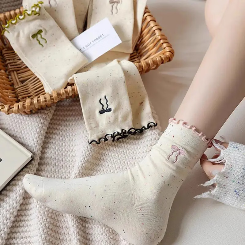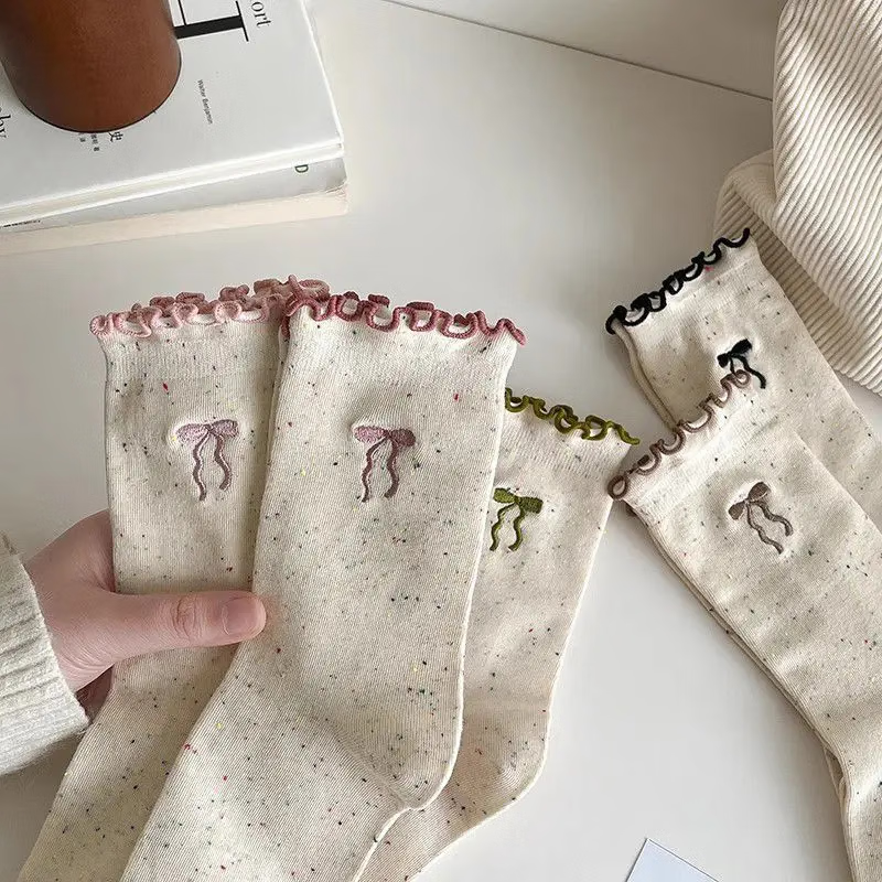 【单双低至1.29】袜子女中筒袜木耳边蝴蝶结点子纱可爱百搭堆堆袜 随机颜色 2双