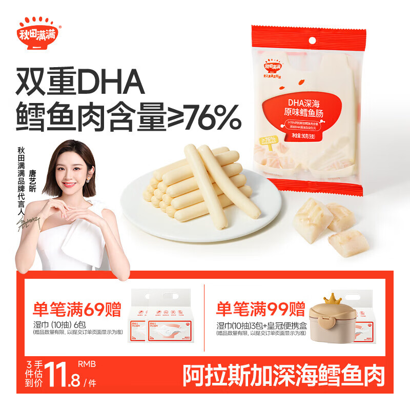 秋田满满 DHA深海鳕鱼肠肉肠原味儿童宝宝零食-享婴幼儿宝宝零食谱90g
