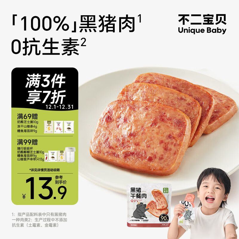 不二宝贝 儿童黑猪午餐肉无蔗糖 儿童宝宝零食搭配宝宝罐头120g单独6片