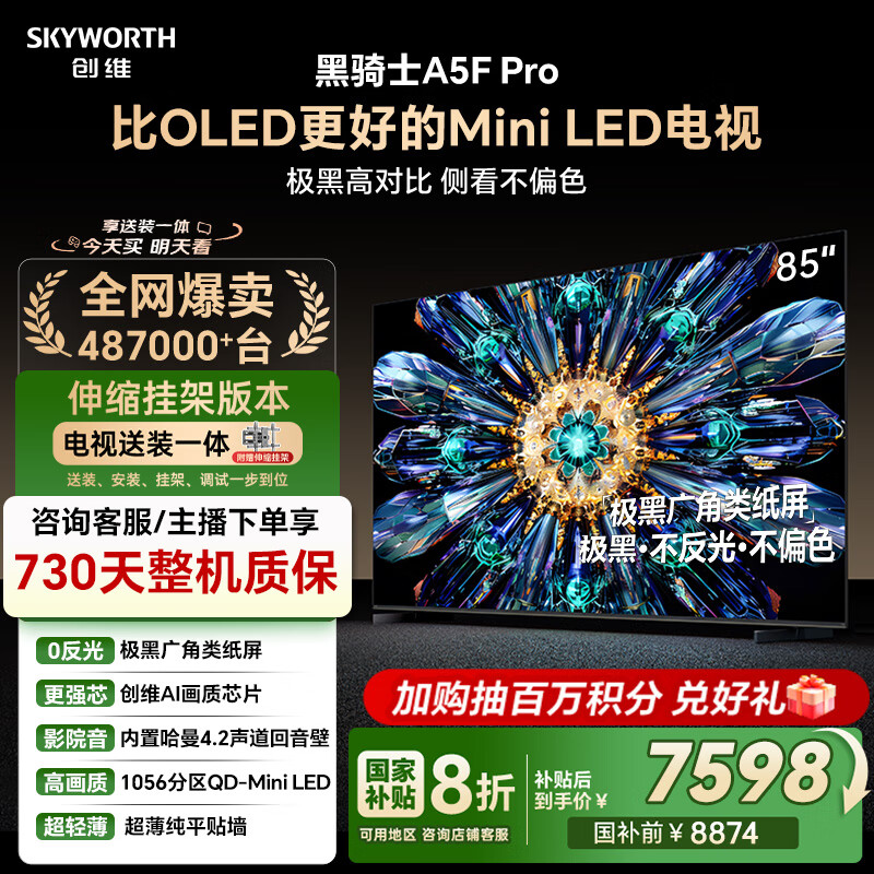 今日推荐:创维电视85A5F Pro 安装版【伸缩挂架送装一体】电视85英寸QD-Mini LED 游戏液晶家电平板电视机