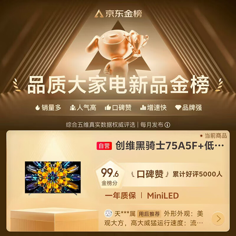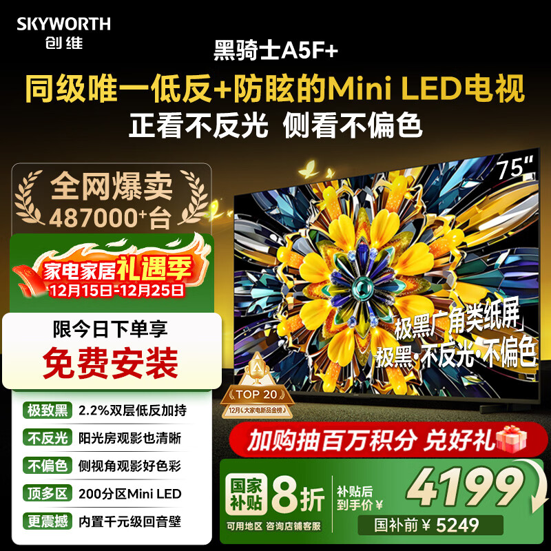 创维电视黑骑士A5F+ 75英寸低反防眩Mini LED电视机 液晶智能家电平板游戏 国家补贴 A5F Mini