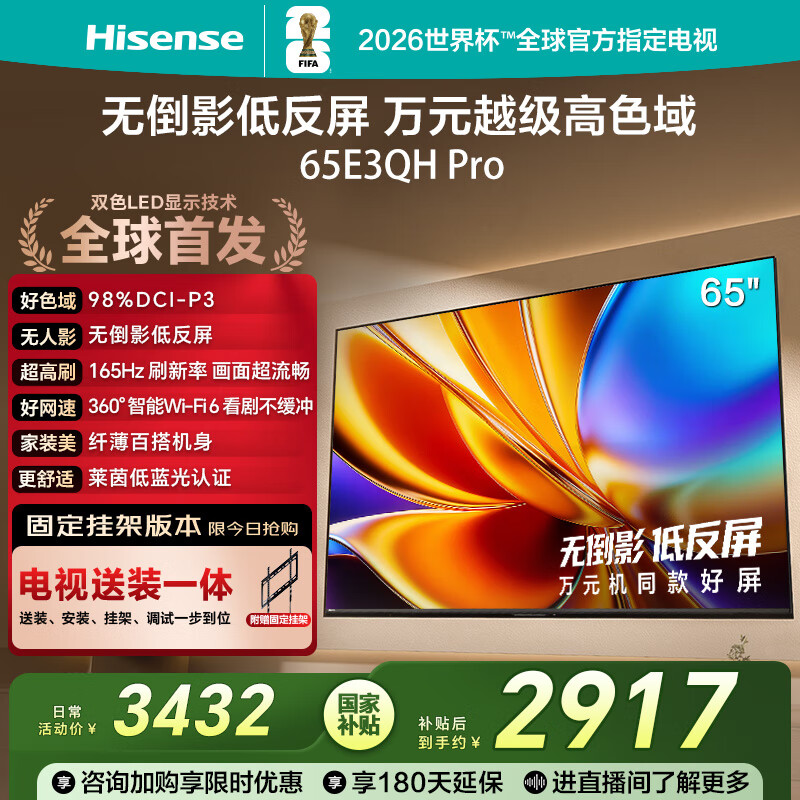 海信电视E3QH Pro 65英寸【送装一体-固定挂架】万元级高色域 抗反光无倒影165Hz高刷限时补贴电视