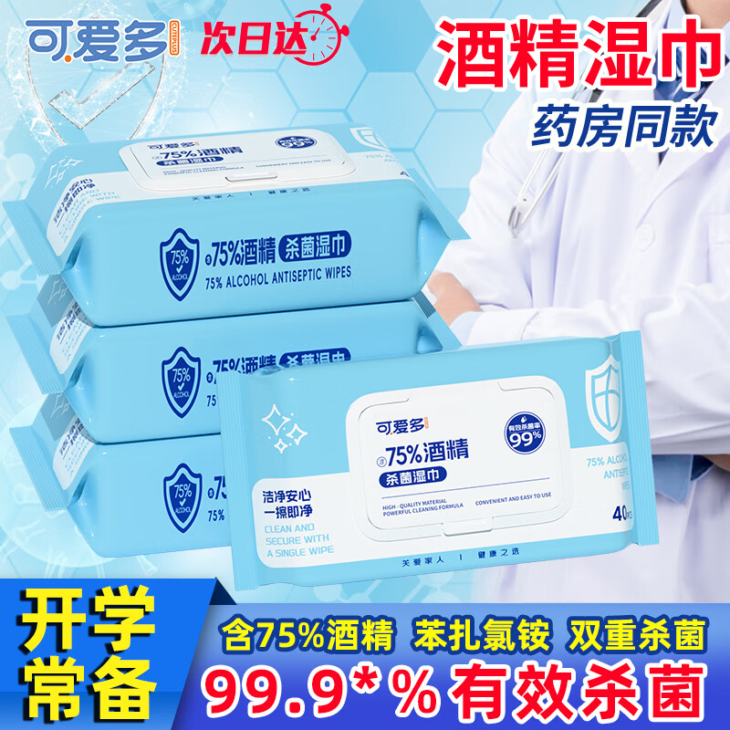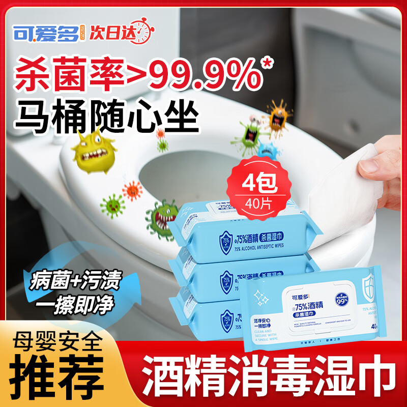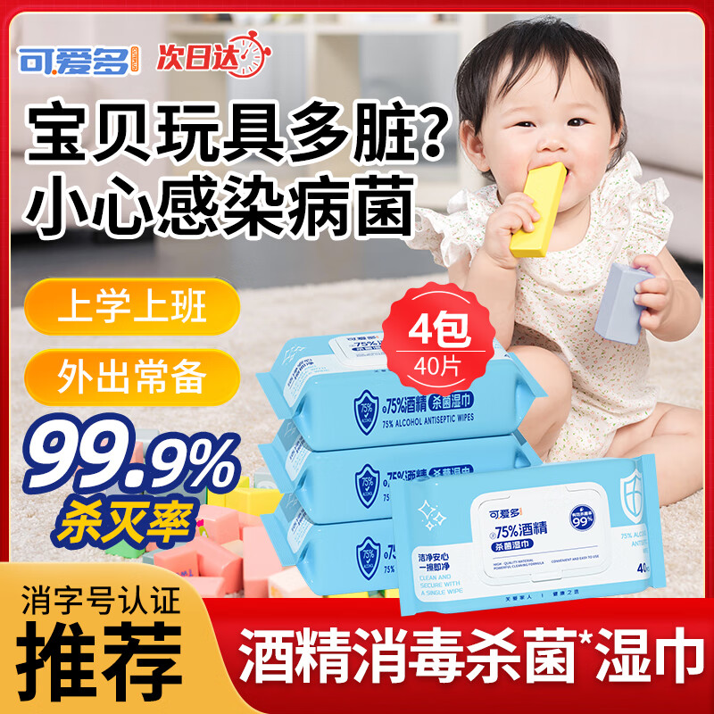 可爱多酒精湿巾75%消毒湿纸巾99.9%杀菌40抽*4包湿巾纸大包儿童清洁湿巾