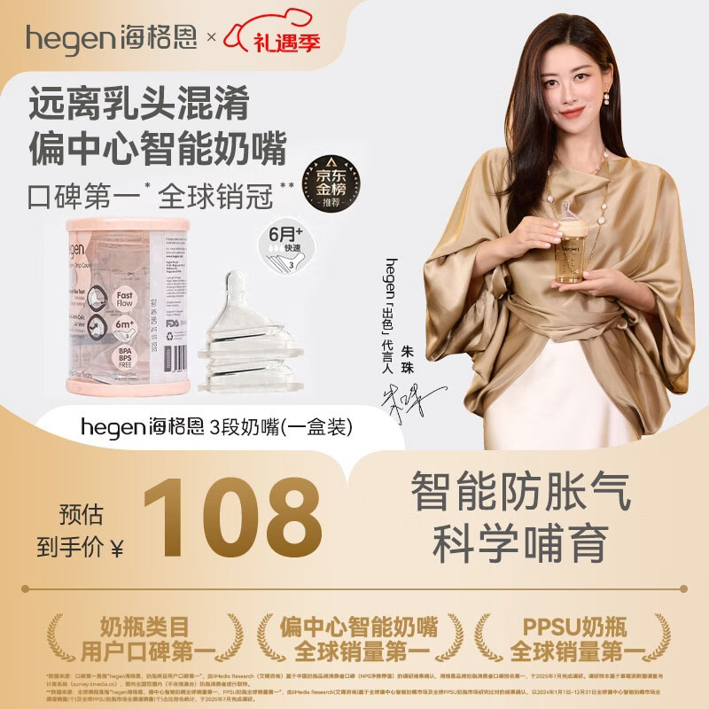HEGEN海格恩奶嘴婴儿偏中心奶嘴设计超软硅胶防胀气3段奶嘴6月+2个装