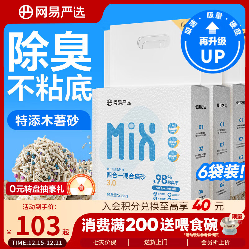 网易严选四合一豆腐膨润土植物混合猫砂结团不沾底除臭木薯猫砂 2.5kg*6包