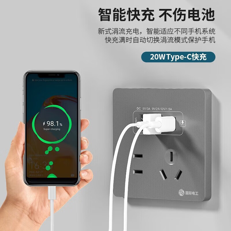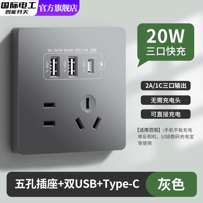 国际电工(FDD)双USB插座面板20W快充墙壁无需充电头Type-c家用五孔插座快充面板 星空灰升级20W快充款【推荐】