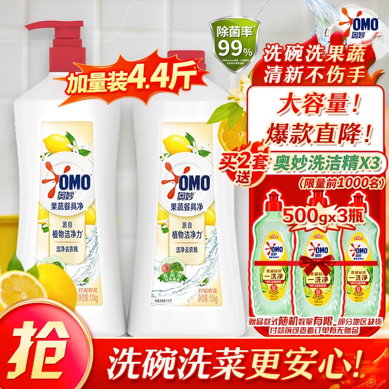 奥妙果蔬餐具净 大桶装 柠檬橙花 不伤手去农残 洗洁精 1.1kg*2