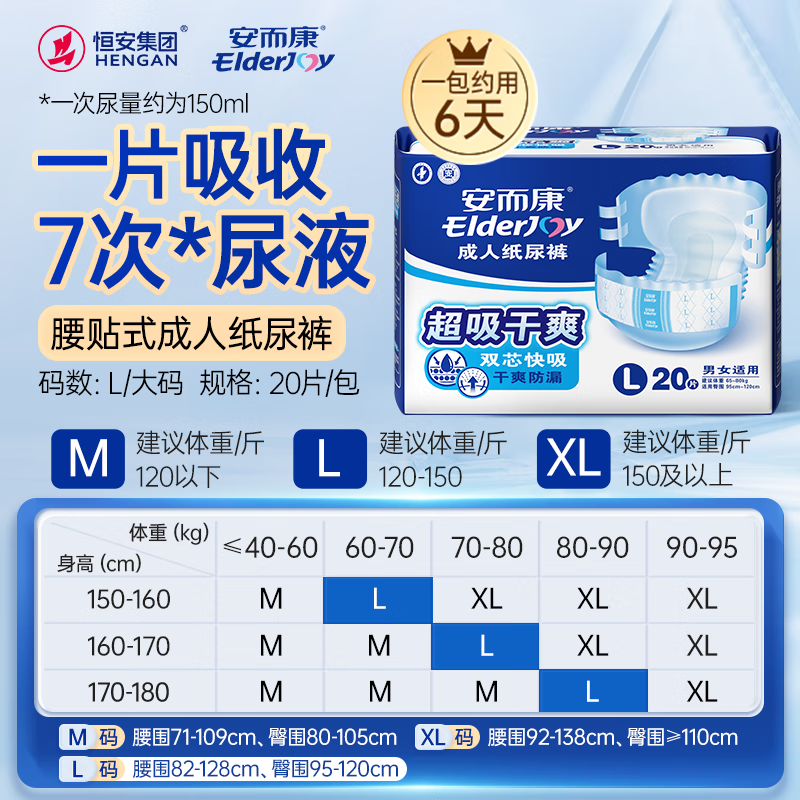 安而康(Elderjoy)超吸干爽成人纸尿裤L20片臀围95-120cm成人尿不湿老人快吸防漏