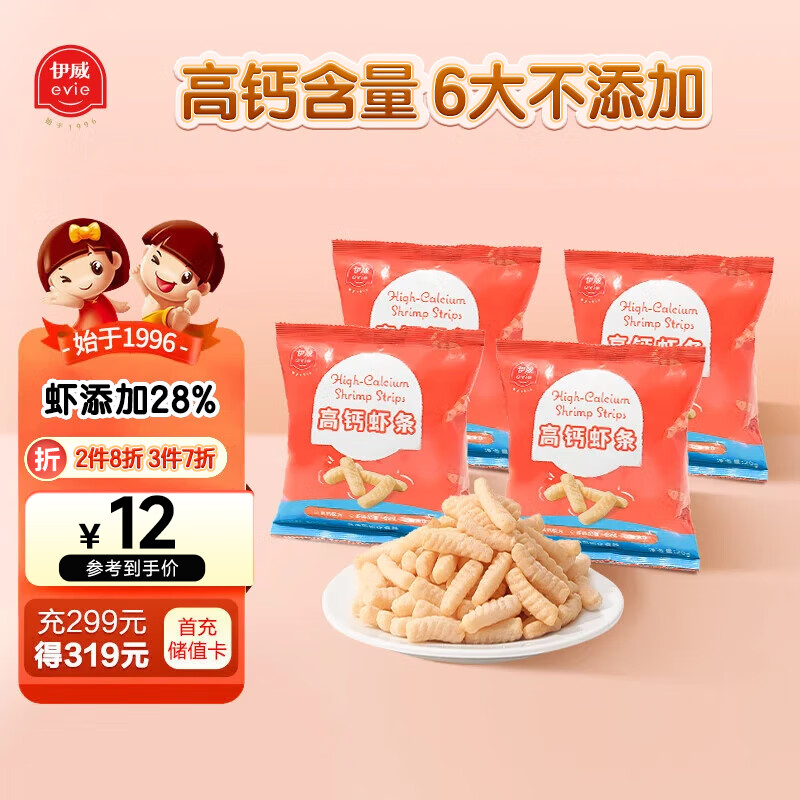 伊威(Eastwes)儿童零食 高钙虾条20g*4 非油炸 虾添加28% 不添加白砂糖