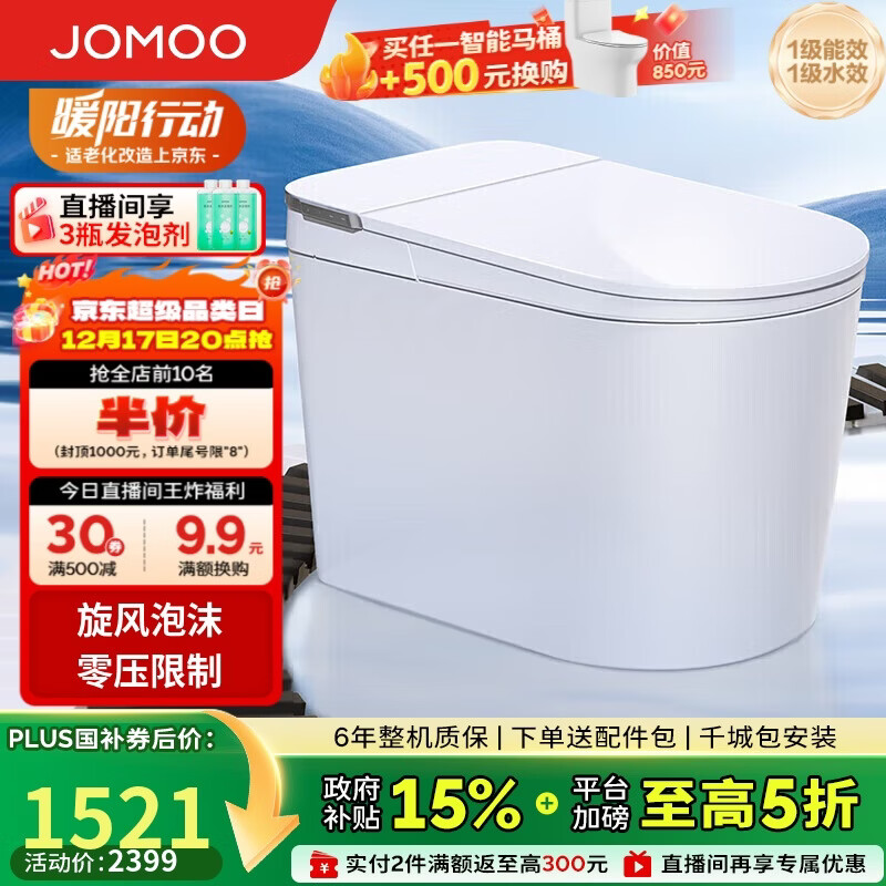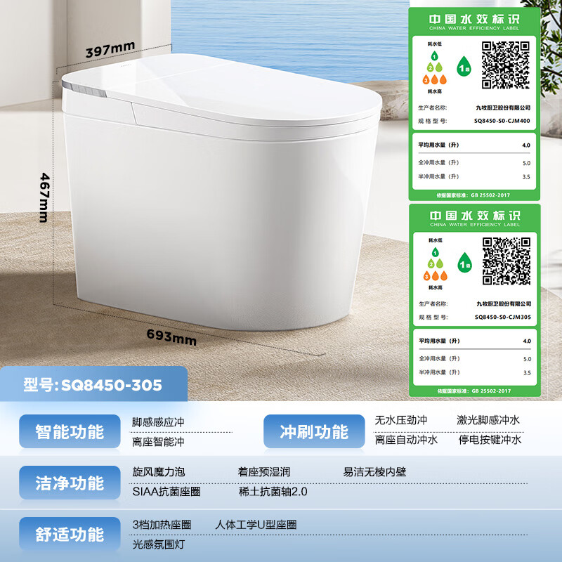 九牧(JOMOO)白魔方无水压限制旋风魔力泡脚感冲水轻智能马桶SQ8450-S0-CJM305