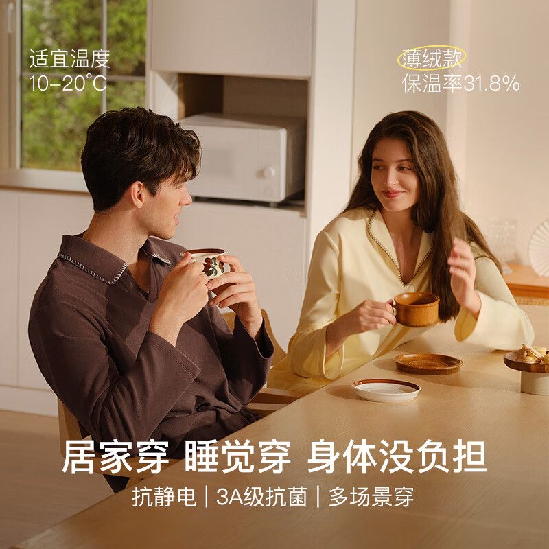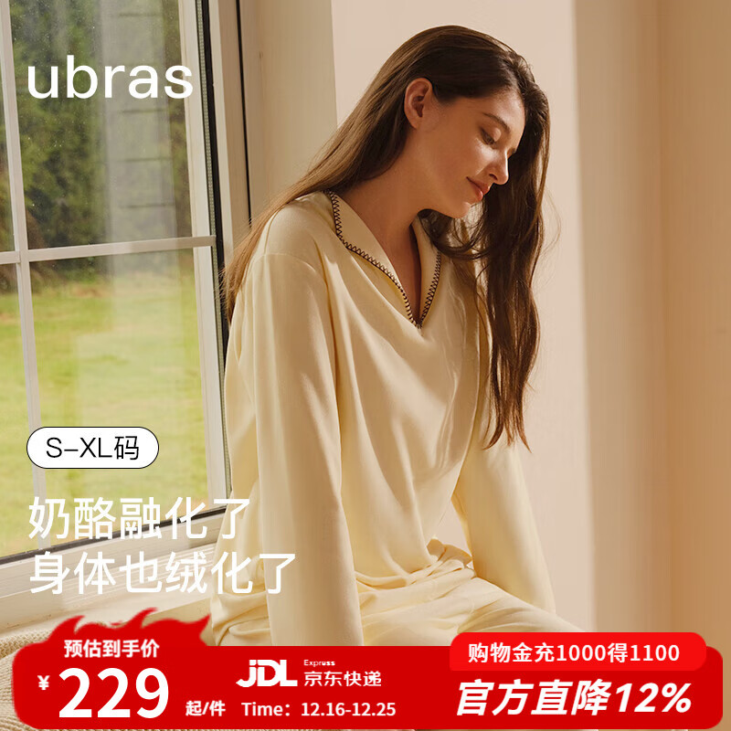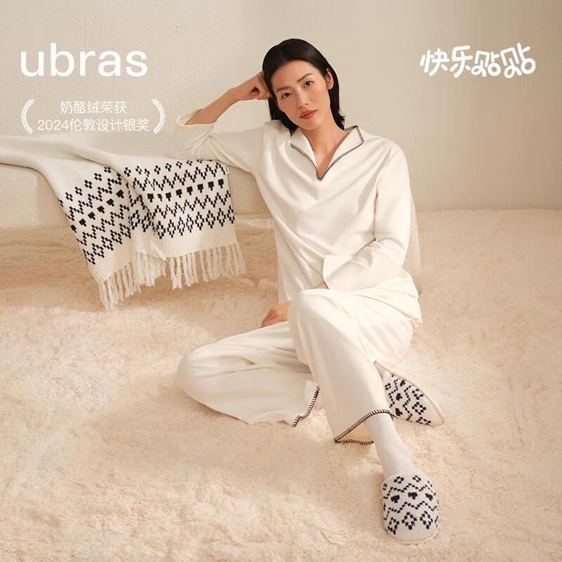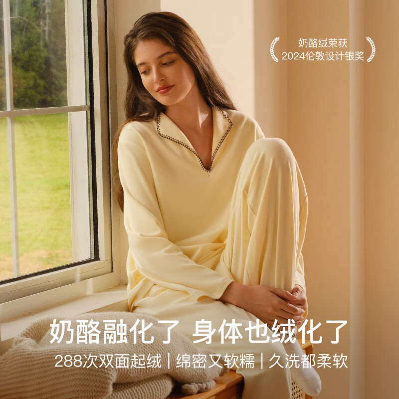 ubras【刘雯同款】奶酪绒刺绣翻领套头长袖长裤套装睡衣女家居服 女套头款-奶酪黄色 M