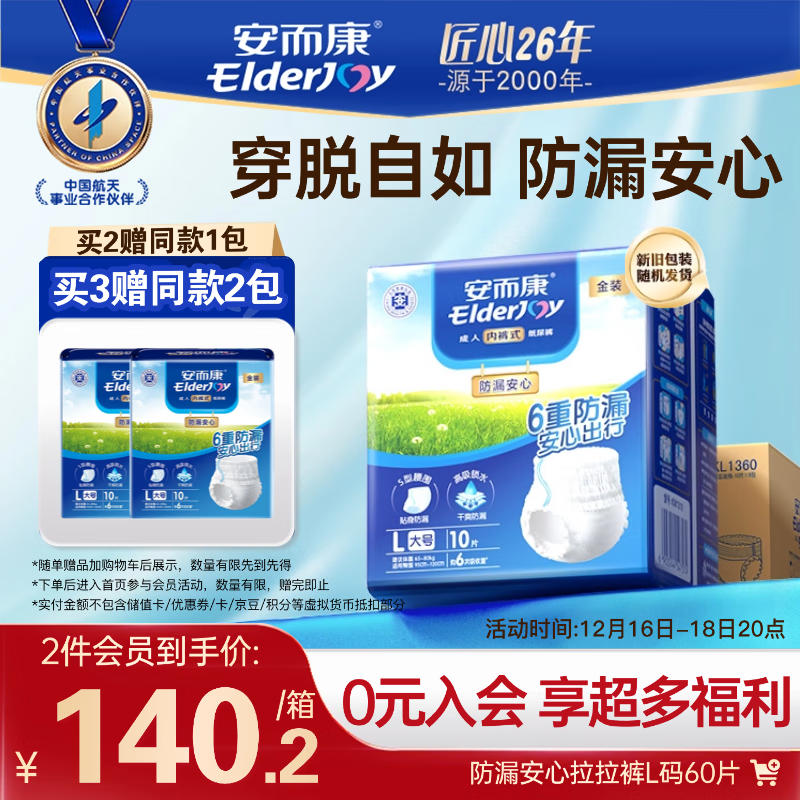 安而康(Elderjoy)防漏安心成人拉拉裤L60片臀围95-120cm内裤式成人纸尿裤易穿脱