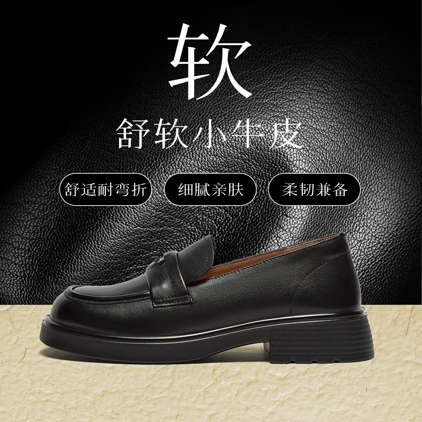 百思图【真皮】商场同款学院风乐福鞋粗跟女单鞋A3512CA4 黑色 38