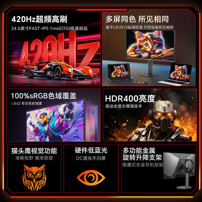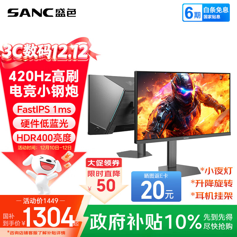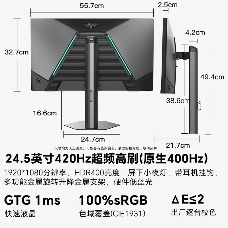 SANC 24.5英寸原生400Hz FastIPS硬件低蓝光超频420Hz HDR400nit 升降旋转 电脑FPS电竞显示器屏幕D5