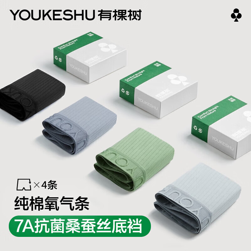 有棵树男士内裤男纯棉7A抗菌裆葫芦囊袋高弹透气条纹四角短裤衩4条装