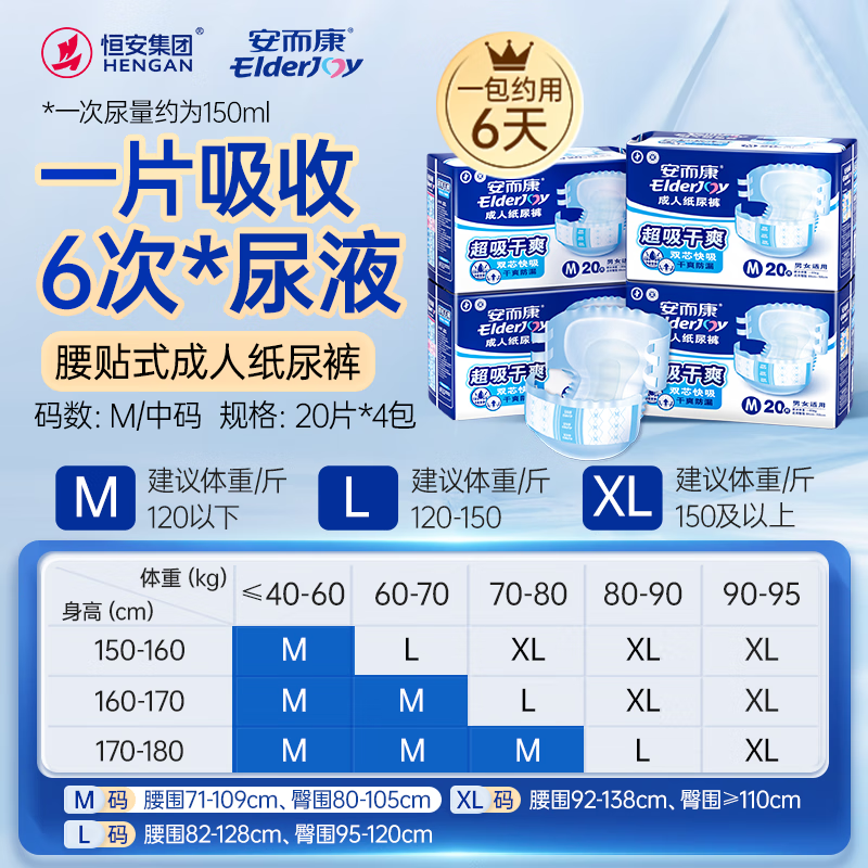 安而康(Elderjoy)超吸干爽成人纸尿裤M80片臀围80-105cm成人尿不湿老人快吸防漏