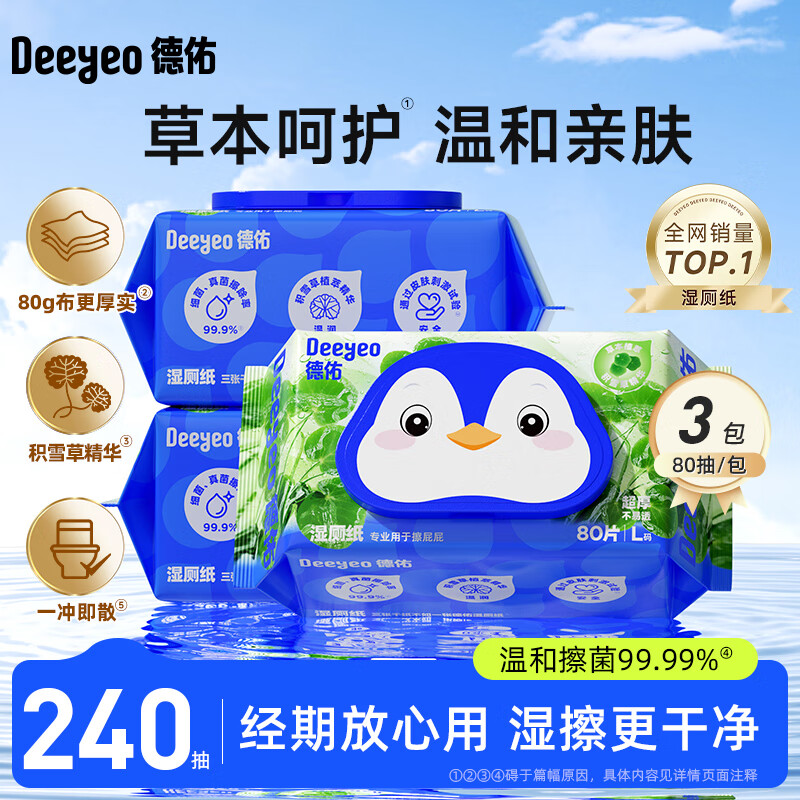 德佑积雪草湿厕纸80抽*3包洁厕湿纸巾厕纸温和草本呵护擦屁屁柔厚升级