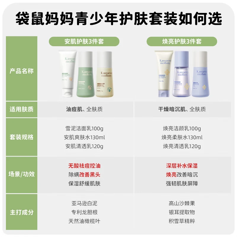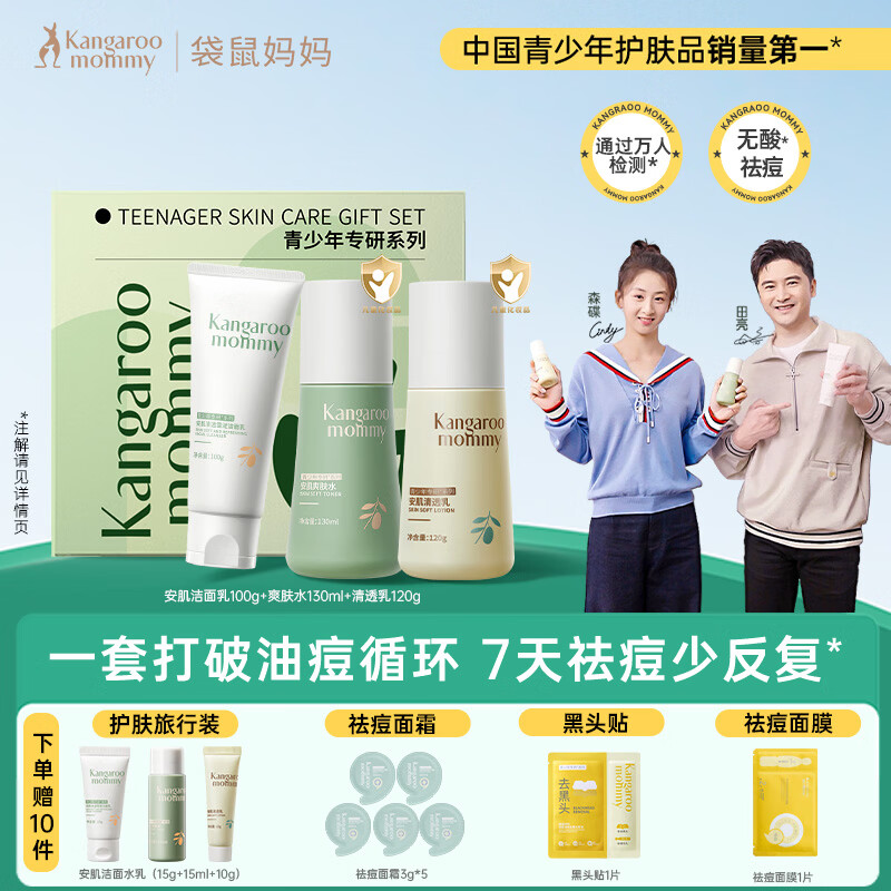袋鼠妈妈青少年护肤套装 控油祛痘洁水乳三件套12-18岁男女孩青春期学生